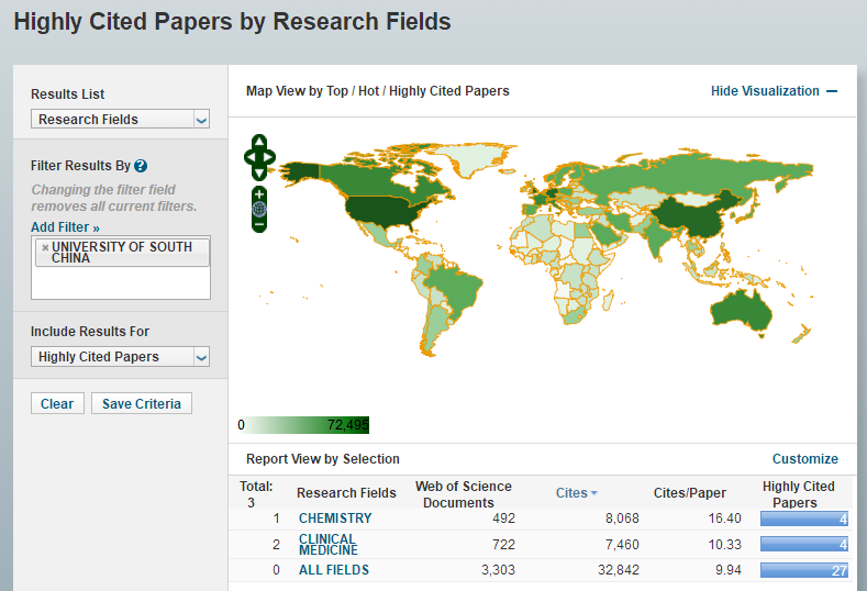 据统计,我校化学学科在过去10年中该学科被ESI系统收录论文492篇,累计被引次数8068次,篇均被引频次16.40次,其中有4篇论文入选ESI高被引论文。