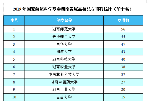 在今年国自科项目平均资助率持续降低和湖南省属高校获批项目数普遍下降的情况下,我校国自科立项数相比去年稳中有升,立项数排名由去年的省属高校第5位升高至第3位,这是“十三五”以来,我校国自科立项数首次进入省属高校前三甲,国自科项目申报数和立项数双双实现突破。另外,我校还有部分联合基金项目正在答辩和评审中,有望进一步增加项目总数。