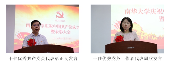 附属第一医院彭正良同志、纪委监察处周欣同志代表第三届十佳优秀共产党员(优秀党务工作者)发言。彭正良讲述了自己赴鄂抗疫出征前、武汉抗疫最前线和武汉保卫战胜利后隔离期间的感人事迹,他表示要牢记党的宗旨,永远守护人民健康。周欣和与会人员分享了她从事党务工作忠心爱党、用心为党、细心护党的体会与感受,表示要只争朝夕、不负韶华,以更加饱满和更加扎实的作风做好党务工作。