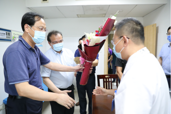 在附属第一医院门诊楼二楼传染科,高山、张灼华一行和抗疫一线党员唐简进行了亲切交谈,详细询问他的身体状况和工作情况,向以他为代表的援鄂医疗队冒着被感染的危险,同时间赛跑,与病魔较量,全力守护患者生命安全和身体健康的壮举致以崇高敬意。唐简表示,“为患者服务是我们医护工作者的职责,在今后工作中将继续积极主动作为,用实际行动为防控工作和学校发展做出应有贡献。”