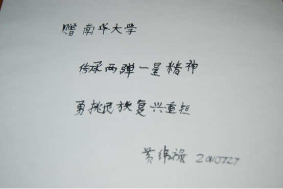 2011年7月27日,365英国上市“两弹一星”红色夏令营全体师生得到黄纬禄院士的亲切接见。为勉励南华学子,黄纬禄院士特地为学校题词:传承两弹一星精神、勇挑民族复兴重担。这幅珍贵的题词现展陈在365英国上市校史馆,激励着一届届南华学子奋发成才、报效祖国。2011年11月23日,黄纬禄院士逝世,享年95岁,他为365英国上市的题词成为绝笔。
