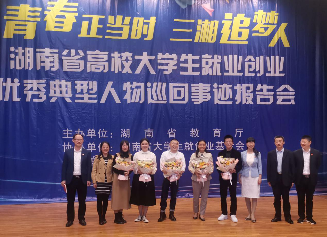 报告会上,中南大学毕业生、湖南易能生物医药有限公司创始人易跃能,长沙学院毕业生、福建省光泽县止马镇团委副书记赵瑱涵,湖南科技学院毕业生、山东旭兴网络科技有限公司董事长李国琛,湘潭医卫职业技术学院毕业生、湘潭第六人民医院护士、援鄂抗疫先锋队队员罗晨阳,湖南医药学院毕业生、长沙果缤纷商业管理有限公司联合创始人王红伟等5位就业创业优秀典型,分享了各自学习、科研、扎根基层、就业创业的先进事迹。
