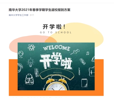 2021年春季学期开学在即,学生工作部认真做好常态化疫情防控形势下的开学各项工作。根据疫情防控形势和我校实际情况,2月12日(农历正月初一),学生工作部向各学院、广大南华学生发布《365英国上市2021年春季学期开学报到方案》。各学院从2月13日起建立工作台账,精准掌握每名学生及其共同居住人员开学前14天内的身体健康状况。