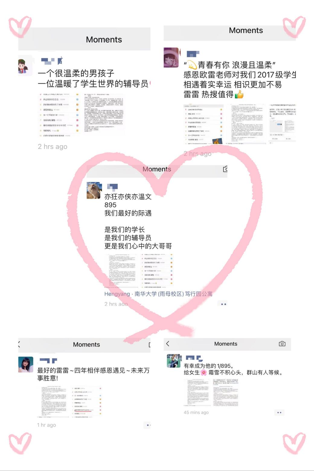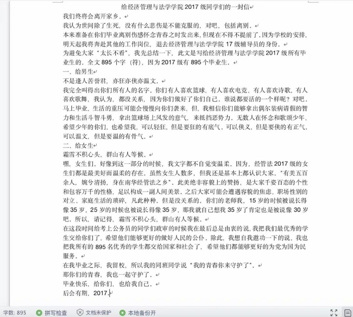 4月26日晚,因工作调动,欧雷提前发布自己写给毕业生的信,作为送达毕业生离校前的一份祝福,希望他们知道天涯有人在等他们,不要畏惧未来。他说全文895个字,是因为2017级有895个毕业生。他写给男生“可以轻狂,但是要狂的有底气,可以侠义,但是要侠的有正气”;写给女生“大家可能会遭遇容貌焦虑、职场性别对立、家庭生活的琐碎,请记得,霜雪不积心头,群山有人等候”。