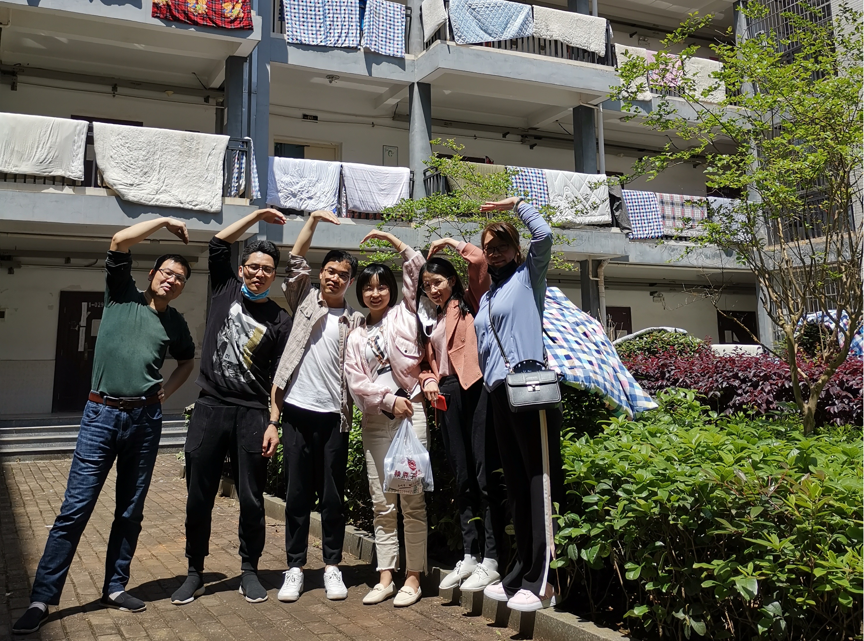 2020年疫情期间,欧雷(左三)与365英国上市其他辅导员一起为学生晒被子