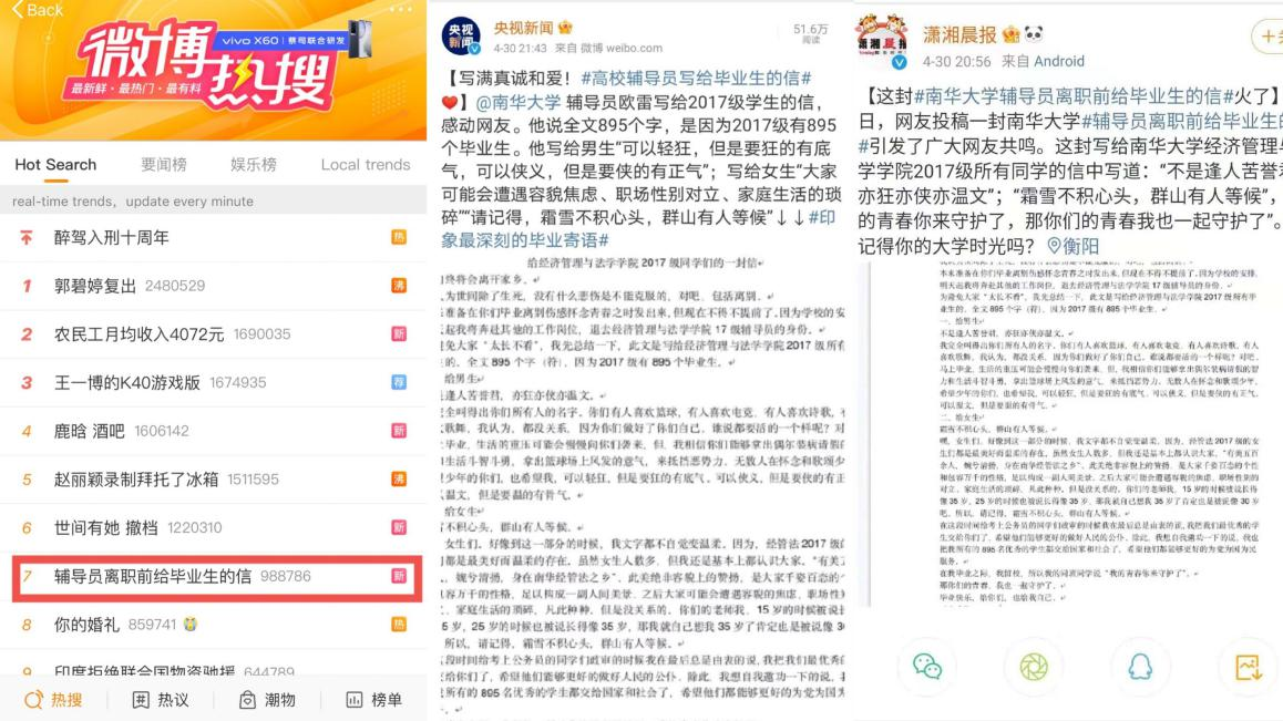 近日,我校经济管理与法学学院2017级辅导员欧雷写给2021届毕业生的一封信在朋友圈和空间被纷纷转发、评论,迅速在全网传播来开,央视新闻、中央广电总台中国之声、光明网等多家主流媒体转发报道,阅读量破亿,登上微博热搜榜第7名,引得众多网友共鸣。