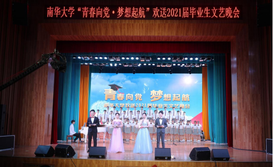 主题为“青春向党 梦想起航”的毕业晚会分为“湘中文墨染韶华”和“四海通途逐初心”两个篇章。晚会节目形式多样、精彩纷呈,贯穿了2021届毕业生在南华校园种种欢笑、泪水、追求与不舍,激荡着毕业生们奋发图强的志向与难舍母校的情感。“青春”“奉献”“百年征程”等关键词让大家激情澎湃,整个晚会现场气氛热烈。