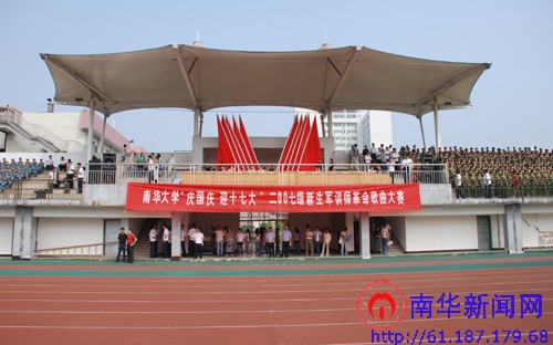 正值全国人民欢庆中华人民共和国成立五十八周年,全国上下喜迎党的十七大召开之际,10月2日下午,我校在北校区田径运动场举行了以“庆国庆,迎十七大”为主题的2007级新生军训革命歌曲歌咏大赛。副校长罗成翼、吴移谋,军政训练领导小组各成员、各学院党总支书记等出席并聆听了比赛。2007级全体新生参加了比赛。