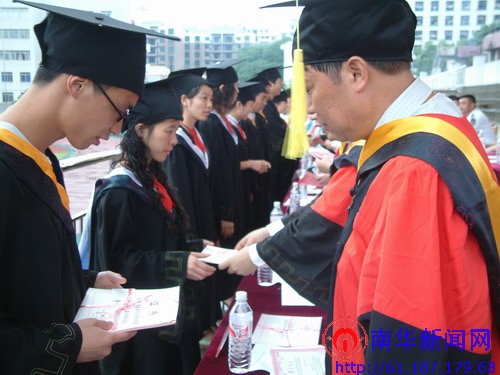 校长文格波发表了热情洋溢的讲话。他代表校党委、校行政向学业有成的毕业生表示最热烈的祝贺,并对毕业生们提出希望:一是希望大家要及时调整自己,尽快适应工作环境,尽快适应社会环境;二是希望大家继续秉承“明德、博学、求是、致远”的校训,在新的工作岗位上要自觉加强道德修养,提高适应时代变化的综合素质;三是希望大家继续传承并光大“勤勉务实、甘于奉献”的南华精神。文校长还诚挚邀请毕业生们参加今年十月份举行的五十周年校庆,并希望毕业生们常回母校,时刻关注母校,支持母校,宣传母校。