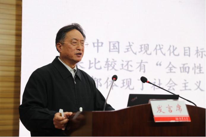 黄百炼以《中国式现代化目标实现的鲜明特色及实践路径》为题作主题发言。他从全面性、均衡性和共享性等三个方面阐释了中国式现代化的鲜明特色,并从牢牢把握中国式现代化目标实现的基本特点,重视人在中国式现代化中的关键作用,贯彻落实新发展理念中更加重视协调,实现中国式现代化目标的关键是发展,加强社会主义先进文化建设,增强忧患意识、坚持底线思维、牢牢把握好中国式现代化目标实现的方向等六个方面阐述了中国式现代化实现的路径。