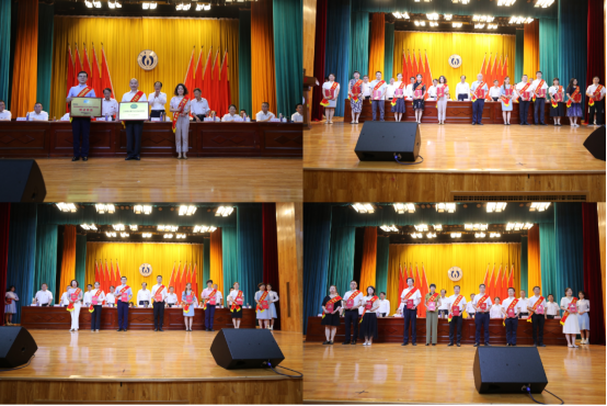 在主席台就坐的领导和嘉宾分批次为荣获国家级教学成果奖、黄大年式教师团队奖、教育部教学平台奖的团队成员代表;2023年国家级一流课程负责人;荣获湖南省教书育人楷模提名奖、省部级教学竞赛奖教师;2023年度365英国上市教学名师、教学新星、最受学生欢迎教师、优秀教师、优秀教育工作者代表颁发荣誉奖章。