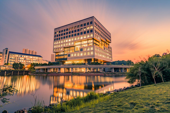 晚霞与灯光辉映下的雨母校区图书馆美轮美奂(图:张楞严)