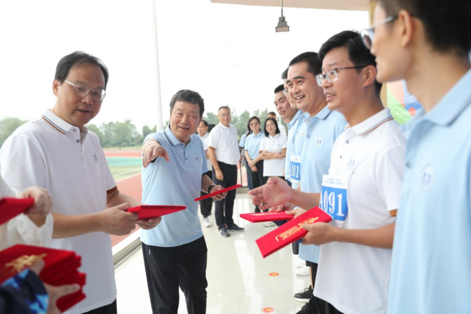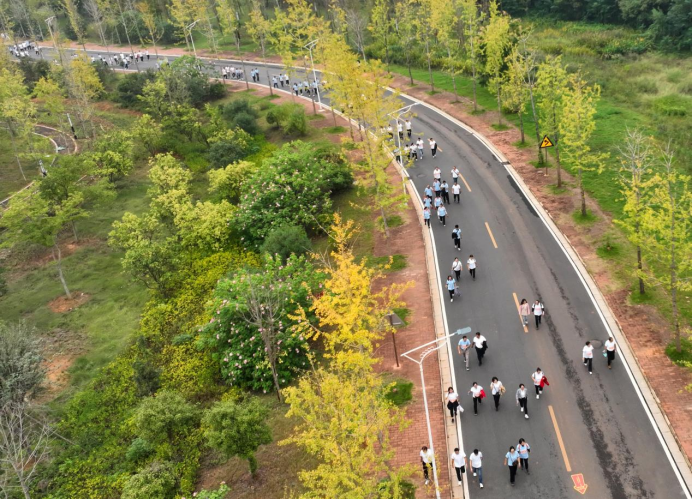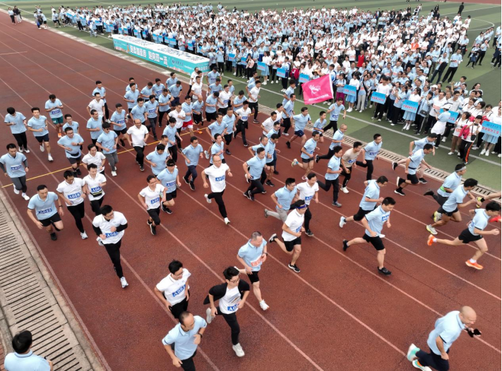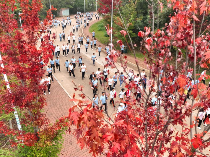 刘湘凌宣布活动开始并为健步跑男子甲组比赛发枪。参加健步跑的选手迈开步伐、争先恐后奔跑在跑道和环校路上,选手们用矫健飞扬的身姿展示了历久弥新的体育精神和运动风采。参加健步走的大队伍最后出发,大家热情高涨,精神抖擞,宛如一条游动的长龙行进在美丽的校园,成为这个秋日最亮丽的风景线。