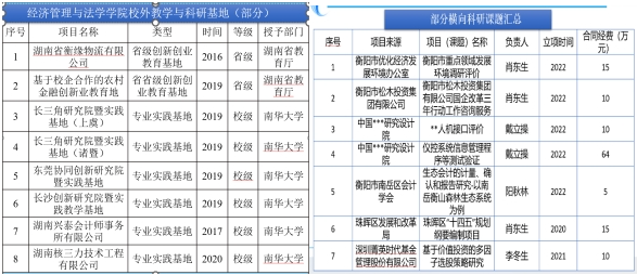 1.拓展实习实践平台。学院与企业合作共建创新创业教育基地、专业实践基地76个,各基地通过协议条款规范校企双方的责权关系,明确实习的目的、内容、方式、流程、管理、指导教师配备、保险等事项,确保实习活动规范、有序地进行。近三年来,68%的教师为企事业、行业、政府提供咨询或培训等服务,获得横向科研项目超过50项。在各类校外教学基地中,工商管理类专业有31个,经济学类专业有20个,法学专业有15个。部分横向课题与校外教学科研基地如下表:
