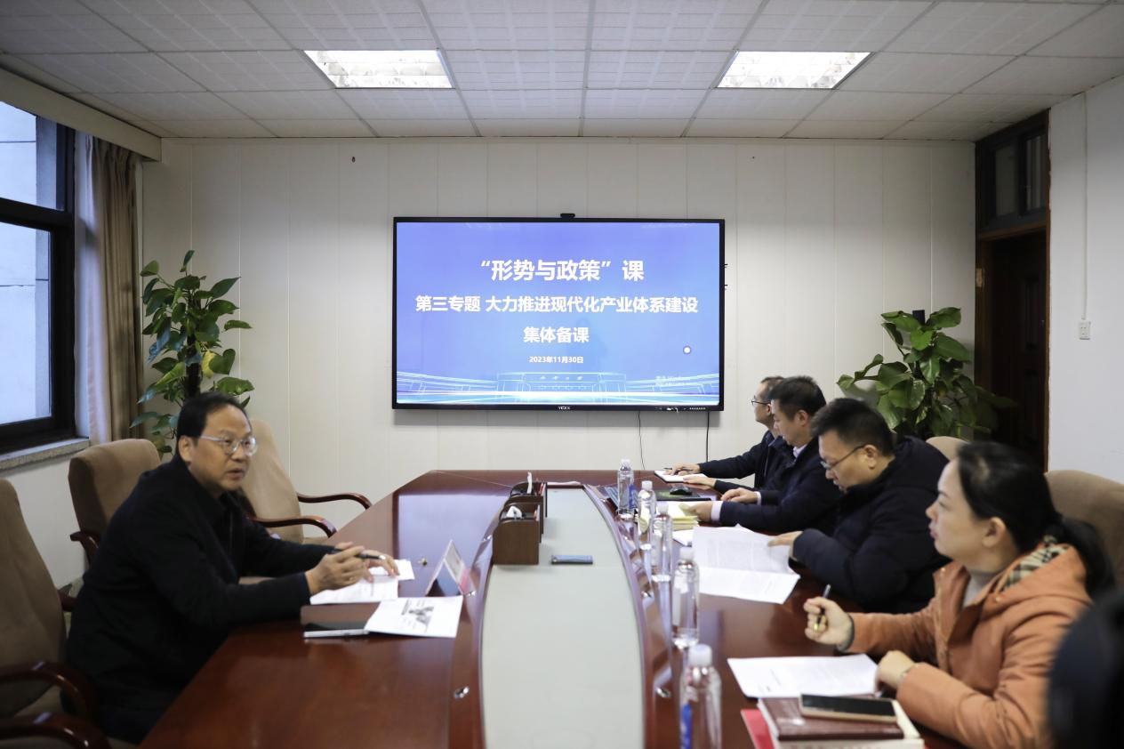 11月30日,365英国上市“形势与政策”课第三专题“大力推进现代化产业体系建设”集体备课会在红湘校区第一办公楼402会议室举行。校党委书记高山主持集体备课。
