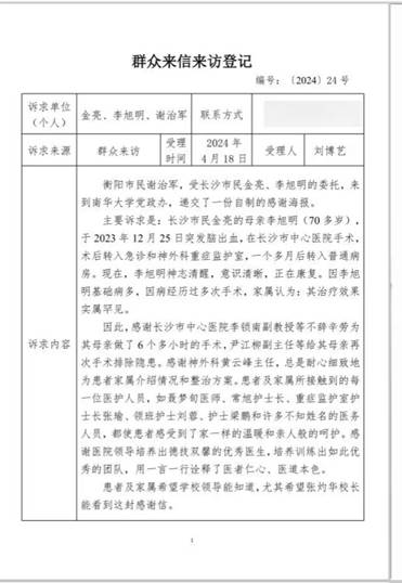 这封感谢信用真挚的言辞,表达了对医院全体医护人员的感激之情,以及对医院优质医疗服务的高度认可。从信中得知,长沙市民金亮的母亲李旭明(70多岁),于2023年12月25日突发脑出血,在长沙市中心医院手术,术后转入急诊和神经外科重症监护室,一个多月后转入普通病房。现在,李旭明神志清醒,意识清晰,正在康复。因李旭明基础病多,因病经历过多次手术,家属认为:其治疗效果实属罕见。
