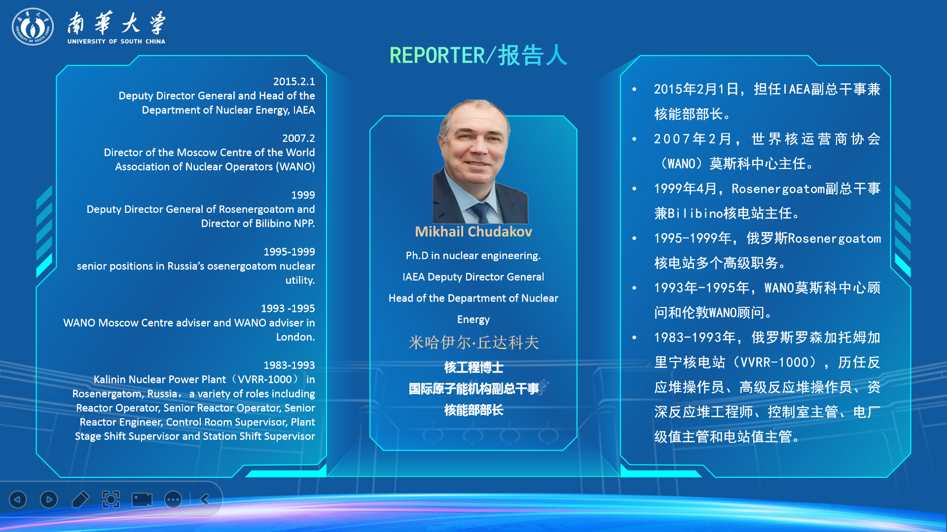 丘达科夫以“国际原子能机构助力可持续能源未来 (IAEA Assistance for a Sustainable Energy Future)”为题,详细介绍了国际原子能机构(International Atomic Energy Agency, IAEA)的历史、组织架构和社会职能,全面展现了IAEA作为联合国系统内专门致力于促进和平利用核能、保障核安全、防止核技术滥用的国际组织,在加强国际核安全合作、促进核科技知识交流等方面发挥了不可替代的作用。