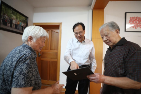 在南校区家属楼,高山来到93岁的老党员、老干部赵训俊教授家里,向他致以节日的问候和祝福,并亲切询问了赵教授的身体健康状况和生活情况,嘱咐他要保重身体,由衷感谢他多年来为学校事业发展所作的贡献。