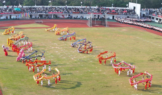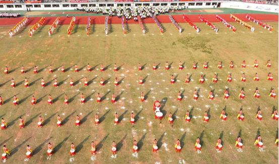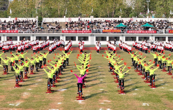 裁判员代表高欣、学生运动员代表毛润宇宣誓后,裁判员、运动员退场,“礼赞新时代——奋进新南华”大型文体表演将开幕式推向高潮。表演分为鼓舞中国、龙腾盛世、召唤青春、追梦南华四部分。整场表演以传承中华民族传统文化精神为核心,结合现代元素,将体育、文化、艺术高度融合,充分展现了南华师生继往开来、开拓进取的豪情壮志。民族大鼓《鼓舞中国》以大气雄浑的节奏为主旋律,配以整齐划一的口号声,充分展现南华学子积极进取、勇攀高峰的毅力与精神。龙狮表演《龙腾盛世》祥龙腾飞,龙狮共舞,逐珠跳跃,“巨龙”摆出的“核”“医”二字,展现了我校核特色与医品牌,彰显了南华人在科技与医疗领域的卓越追求与非凡成就。随着音乐的节奏,动感单车表演者们如同精灵般在单车上跳跃、旋转,充满了力量与节奏感,是一场力与美的结合,是运动与艺术的交融。团体操表演气势恢宏,场面壮观,仿佛一幅幅动态画卷在观众眼前徐徐展开,表演者们以“75”的造型,献礼祖国,传递深情与祝福。