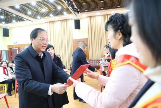 高山为受表彰女职工颁奖