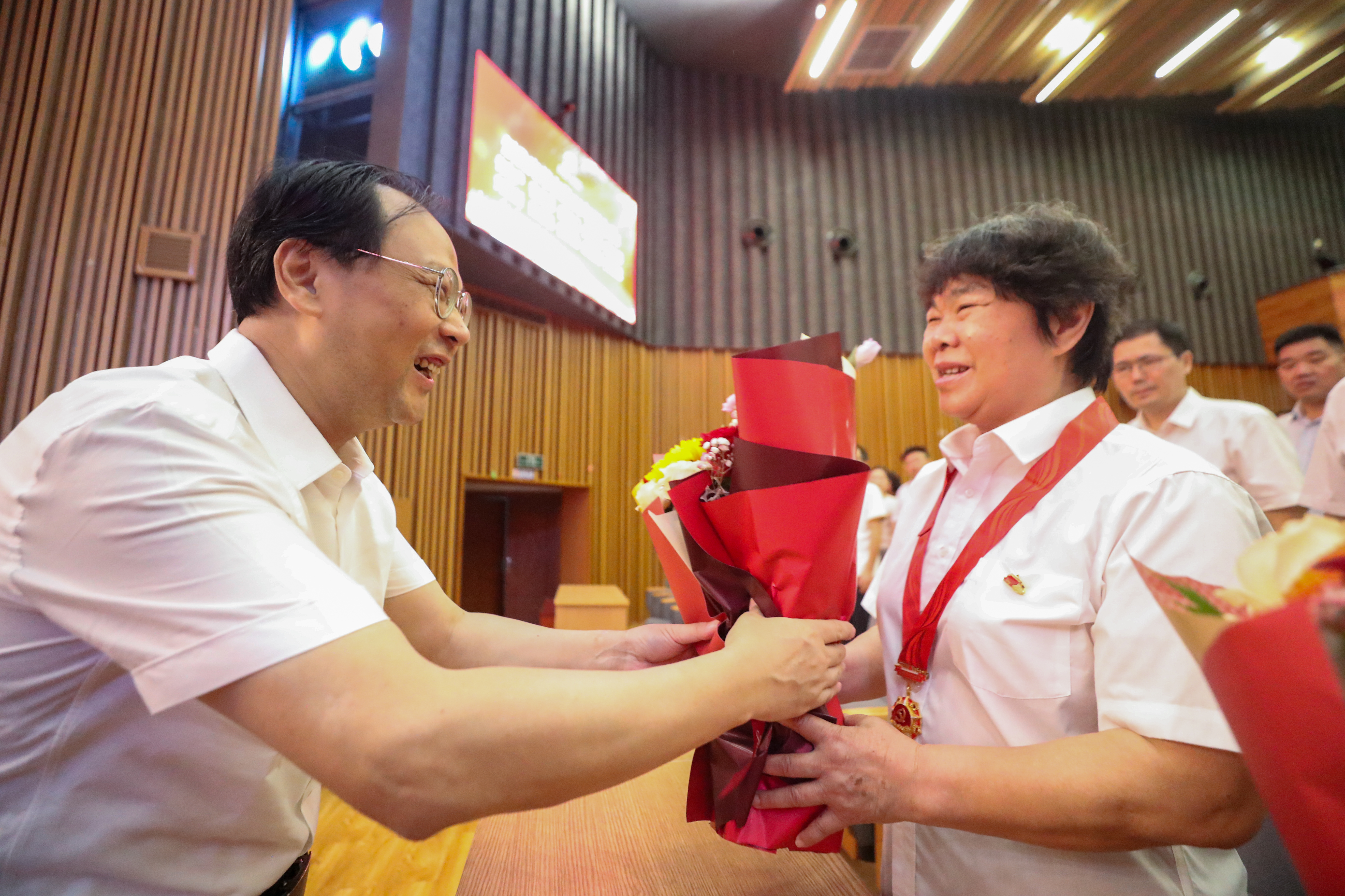 高山为“光荣在党50年”的老党员代表颁发纪念章并送上鲜花