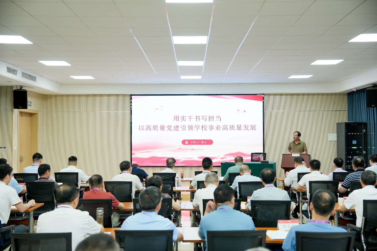 高山以“用实干书写担当,以高质量党建引领学校事业高质量发展”为题讲授专题党课。他强调,要牢固树立“围绕发展抓党建、抓好党建促发展”的鲜明导向。坚持筑牢政治根基,把准高校根本属性,扛牢使命担当,落实立德树人根本任务,把牢前进方向,服务国家战略需求。要科学把握“高质量党建”与“高质量发展”的辩证统一关系。深刻认识高质量党建是实现高校高质量发展的根本保证,以班子建设统揽发展全局,以管党治党推进系统布局,以层层抓落实构建工作格局;完善党建促发展机制,攻克党建促发展难关、改进党建促发展作风,推动党建与事业发展同频共振,致力于实现人才培养、科学研究、社会服务、文化传承创新四大职能,打造人才培养新模式、创造科学研究新范式、探索社会服务新方式、激发文化传承新活力。要提升融合“高质量党建”和“高质量发展”的整体效能。要坚持锻炼系统思维、抓重点、示范引领和抓落实等四项能力,求真务实,敢做善为,以高质量党建引领学校事业高质量发展。