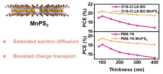 为突破这一厚度-效率制约的根本性难题,本研究通过液相剥离法制备单层MnPS3纳米片,借助多模态表征证实其可有效扩展激子扩散距离并提升面外电荷迁移率。单层MnPS3纳米片辅助作用下基于PM6:Y6体系的有机太阳电池实现了19.53%(100 nm厚度)和18.41%(300 nm厚度)的破纪录功率转换效率,展现出94.3%的超高膜厚耐受性,创造了有机太阳电池领域的最高膜厚耐受性纪录。该策略的普适性进一步在D18-Cl:L8-BO体系(100 nm / 300 nm厚度:20.45%/19.70%功率转换效率)和D18:L8-BO体系(100 nm / 300 nm厚度:20.41%/19.62%功率转换效率)得到验证,其膜厚耐受性均超越现有的顶级有机太阳电池。此项工作为解决工业级有机太阳电池制造中光子捕获与电荷提取的核心矛盾提供了普适性设计原则,为有机太阳电池实现商业化“卷对卷”印刷生产奠定了理论与实验基础,具有重要的科学意义和应用前景。