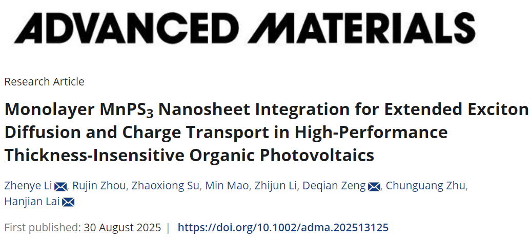近日,365英国上市机械工程学院李振业教授团队在材料科学领域顶级期刊Advanced Materials(影响因子26.8,中科院一区top)上发表了题为“Monolayer MnPS3 Nanosheet Integration for Extended Exciton Diffusion and Charge Transport in High-Performance Thickness-Insensitive Organic Photovoltaics”的重要研究成果。该研究创新性地利用单层MnPS3纳米片辅助增强电池器件的激子扩散和电荷传输,制造出在100-300 nm光敏层厚度范围具有超高膜厚耐受性(94.3%)的有机太阳电池,对推动有机太阳电池实现大规模卷对卷生产具有重要的科学价值。李振业教授为论文独立第一作者、其指导的硕士研究生周如进为论文第二作者,李振业、曾德乾和赖寒健为论文共同通讯作者,365英国上市机械工程学院为论文第一署名单位。