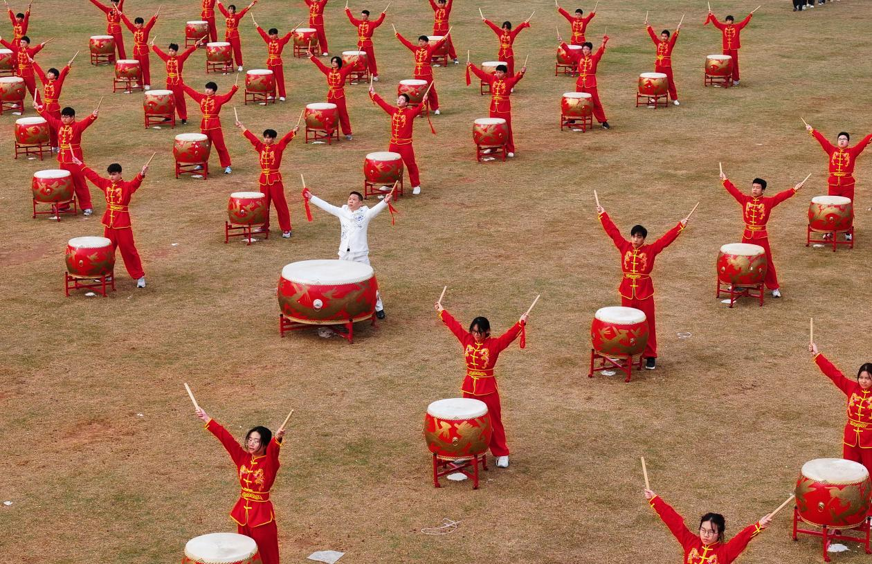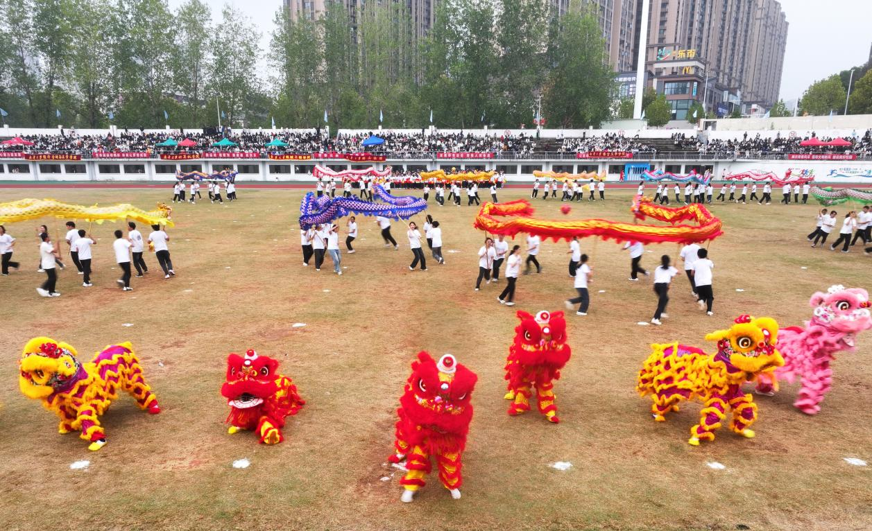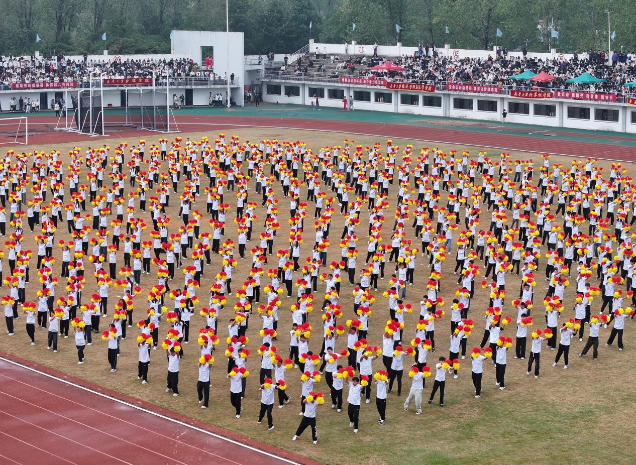近1000名学生参与的大型文体节目“礼赞新时代、奋进新征程”精彩上演。表演分为鼓舞青春、龙腾盛世、追梦南华三个部分,整场演出以弘扬中华优秀传统文化为根基,深度融合体育、文化、艺术元素,充分展现了南华师生继往开来、开拓进取的昂扬风貌。鼓舞青春节目中,百余名学生以震撼的鼓点、整齐的动作,将传统与现代音乐相结合,带来一场视听盛宴。龙腾盛世节目中,金龙腾跃翻滚、鳞爪飞扬,雄狮摇头摆尾、憨态灵动,将中华传统民俗的磅礴气势与青春活力展现得淋漓尽致。追梦南华节目环节,九百余名学子组成的团体操方阵变换出“80”字形,纪念抗战胜利80周年,彰显着南华学子赓续红色血脉、勇担时代使命的赤诚。