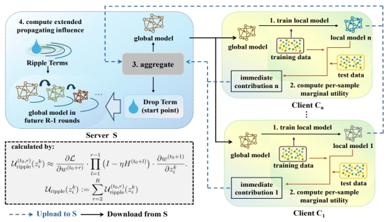 数据贡献度评估(Data Attribution)是联邦学习激励机制与可信协作的核心问题,其旨在量化各参与方或样本对全局模型性能的真实影响。现有基于Shapley值的理论方法通常面临高昂计算复杂度,同时忽略了数据影响的时序传播特性,而无法有效反应样本的真实影响。团队提出了一种在单次联邦训练过程中实现高精度、低开销数据价值归因的全新框架——Ripple Shapley,为联邦学习中长期影响建模提供了理论突破与实践路径。团队首次从时序传播视角出发,将样本影响分解为Drop项(刻画样本在初始轮训练中的即时效用)与Ripple项(建模样本影响如何经多轮全局更新逐步扩散)。这一建模揭示了联邦优化的递归依赖结构,实现了对跨轮次影响路径的显式追踪,从而将Shapley值从静态公平性理论拓展到动态影响归因机制。